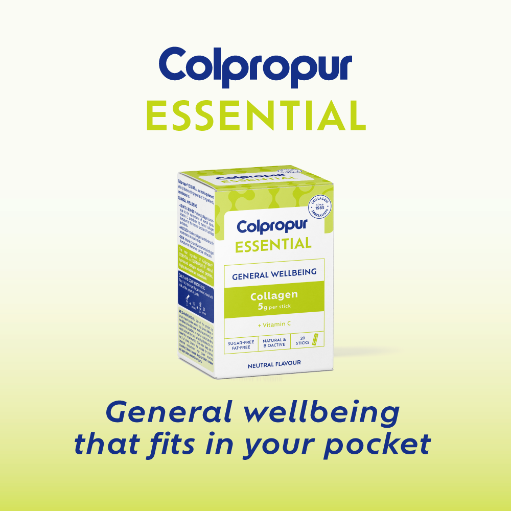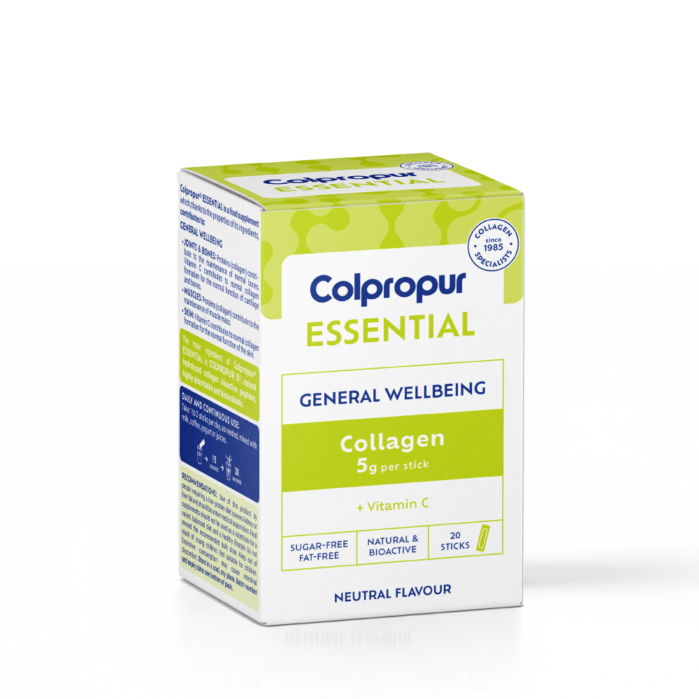 An essential product made with hydrolysed collagen and vitamin C, Colpropur ESSENTIAL helps stimulate collagen production in the body, promoting the well-being and vitality of bones, skin and joints.